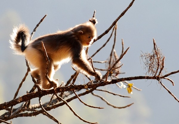 一只滇金丝猴在云南迪庆藏族自治州白马雪山国家级自然保护区内的大树上觅食。滇金丝猴是中国特有的一级珍稀濒危保护动物,仅天然分布在云南省迪庆藏族自治州的维西、德钦等县和西藏自治区的芒康县等地的高山森林之中,现存总数量约2000只。 (新华社发)