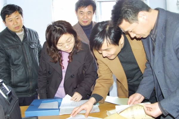 图为省、市、区相关领导在该镇大桥街道居委会查看农村统计报表。
