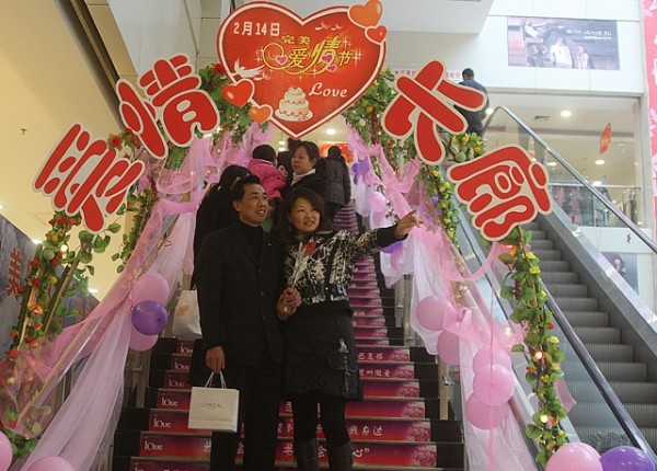 2月14日,我市各大商家纷纷营造浪漫、温馨的气氛。当天,中商百货近百米长的台阶张贴的“爱的宣言”,悬挂的留言板供有情人表白爱意、送祝福,新款别致的“爱情长廊”吸引过往情侣与行人驻足留影拍照。 (本报记者 杨闻名 通讯员 王 刚摄)