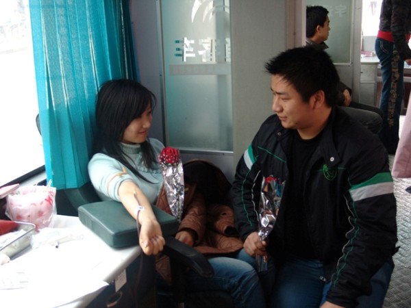二月十四日情人节,有不少情侣相伴来到街头献血车上共同献血,以这种有意义的方式来见证彼此的爱情。对此,市中心血站特别准备了鲜花和礼品,并为每一对在节日当天参加无偿献血的情侣拍照留念。(王松摄)