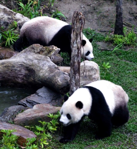 “团团”“圆圆”对户外环境很适应,不断跑上跑下,非常兴奋。尤其是 “圆圆”,爬坡、攀岩、上架,在瀑布下戏水、追逐“团团”,似乎精力无穷。而“团团”则比较“沉稳”,闲庭信步,悠然自得。偶尔也爬爬树,啃啃竹子,和“圆圆”嬉戏、打闹。最令现场观众高兴并直呼“太可爱”的场景是“团团”“圆圆”一起跳下水池,“泡汤洗浴”。