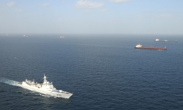 2月18日,中国海军编队成功护送13艘商船安全驶出亚丁湾,这是海军编队完成的第21批次护航任务,也是执行护航任务以来的最大规模的护航行动。接受本次护航的有10艘中国商船,此外,航经此海域的德国、新加坡和塞浦路斯的3艘外国商船主动要求加入我护航编队。船队绵延10公里,场面蔚为壮观。图为“海口”舰(前)在为商船护航。 (新华社发)