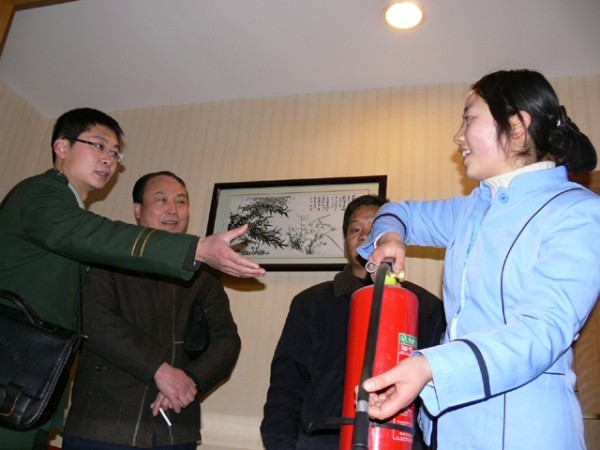 24日,曾都区消防大队的消防队员正在检查曾都宾馆服务人员使用灭火器情况。连日来,曾都区商务局联合区消防大队专业人员,深入到所属的宾馆、酒店等,对消防安全隐患进行大排查,对于发现出来的问题及时督促改正,大大提高了从业人员的消防安全意识,确保了顾客的安全。 (钟克波 张道明摄)