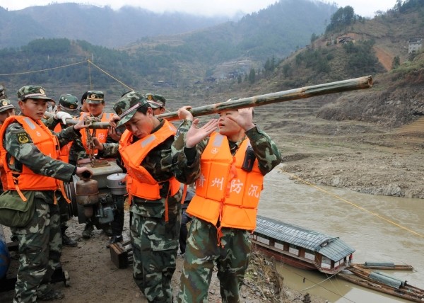 3月4日,参加搜救的消防官兵抢运搜救设备到事故现场。3日10时许,剑河县柳川镇水域九龙滩落水坡脚,发生一起10人下落不明的重大水上交通事故,事故发生的主要原因是由于船舶严重超乘客定额载客,冒险航行所致。据事故调查组对脱险乘客和船主的一一核对与回忆,事发船只上共有46人,。但截至记者发稿时,仍未找到失踪人员。 (新华社发)
