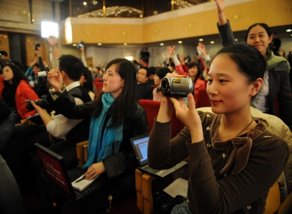 3月7日,记者在全国政协十一届二次会议记者会上拍摄采访。临近“三·八”妇女节,为两会服务的女工作人员、采访两会的女记者等在各自的岗位上尽职尽责,成为一道亮丽的风景。新华社发