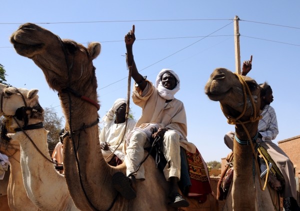 3月8日,在苏丹达尔富尔地区法希尔市,几名苏丹达尔富尔地区游牧部落成员在街头抗议国际刑事法院逮捕令,声援总统巴希尔。 (新华社发)