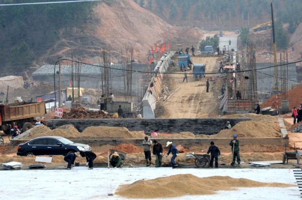 下图:炎帝神农景区建设目前正在紧锣密鼓地进行之中。图为谒祖广场前面的九拱桥施工现场。九拱桥位于烈山湖上,由九个孔组成,将来就从这里进入。