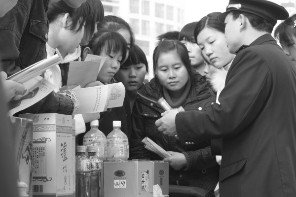 执法人员教会消费者如何识别真假酒类食品