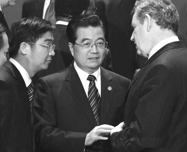 4月2日,国家主席胡锦涛出席G20领导人第二次金融峰会。图为胡锦涛在同与会各方领导人合影时与英国首相布朗交谈。 (新华社发)