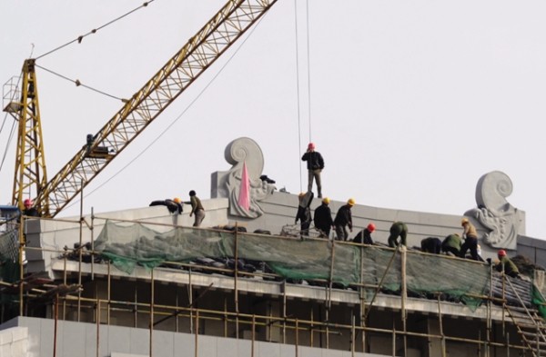 炎帝神农大殿房脊由花岗岩石材砌成,重达数十吨。特别是房脊两端的龙头,由整块巨石雕塑而成,每个重约5吨,吊装难度系数很大。 (本报记者 李文军摄)