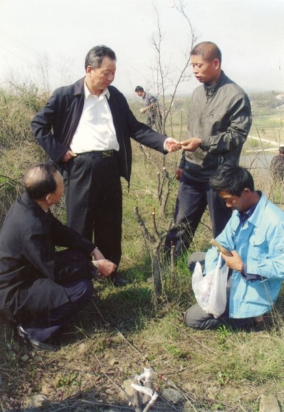 4月8日,随州市老区建设促进会负责同志在广水市关庙镇关南村同来自山西省的技术员一起,帮助老区农民发展枣产业致富,该村枣树嫁接已达350亩,3年后便可为农民增加收入200多万元。 (石守京 摄)