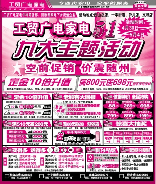 4月29日,新世纪购物广场家电城将全面启动“非常5+1”促销活动。购家电单件满500送480;液晶电视4折起售;冰箱洗衣机5折起售;空调6折起售;原价698的手机,现只卖188元;原价4999元的32寸液晶现只卖1999元;美的、格力两大一线品牌空调重磅出击,再次上演价格争霸赛;部分生活电器7-8折销售;购生活电器单件满300元加10元送电水煲,满500元加20元送电饭煲,满800元加50元送电磁炉,满1000元加100元送微波炉,满1500元加200元送21寸彩电;全场手机4-6.8折起售;还有大量特价机型全面让利特卖,再度发力“五一”黄金周。