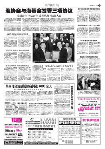 新华社4月26日电 26日上午,海峡两岸关系协会会长陈云林与台湾海峡交流基金会董事长江丙坤在南京紫金山庄举行两会恢复协商以来的第三次会谈。 双方在解决两岸空中定期航班、金融合作、共