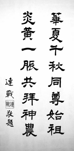 本报讯 通讯员罗彦报道:“五一”前夕,一封来自台湾立法院的特殊信函寄至随州市委,国民党名誉主席连战先生为即将举行的 “中国湖北随州烈山首届世界华人炎帝故里寻根节”题写节名,并奉上“华夏千秋,同尊始祖;炎黄一脉,共拜神农”书法作品一幅,16个遒劲的大字透出一个炎黄子孙对始祖的深深敬仰之情。