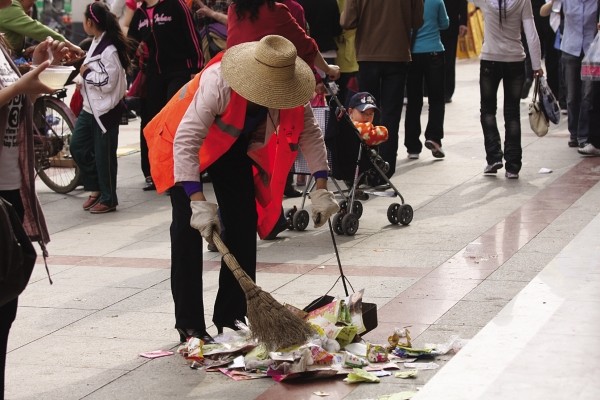 图③:5月1日,繁华的城区解放路上,一位幼稚小男孩不停回头看着环卫工人清扫垃圾。“我们过节不能放假,因为假日的工作量比平时要多得多。”环卫工人聂世兰说。
