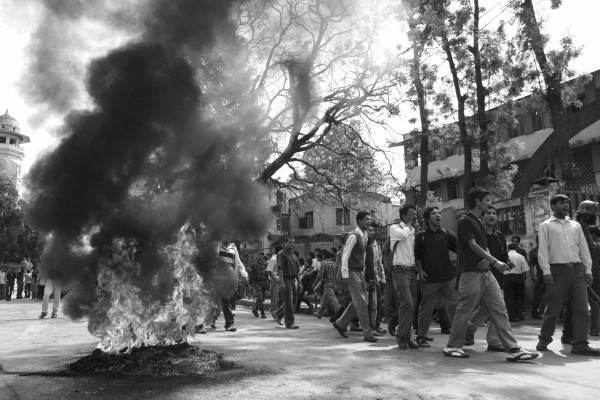 5月3日,尼泊尔学生示威者走上加德满都街头,抗议政府解除尼军参谋长鲁克曼古德·卡特瓦尔的职务。当日,尼泊尔政府发言人称,尼政府决定解除尼泊尔政府军参谋长卡特瓦尔的职务,并任命卡德卡为代参谋长。 (新华社发)
