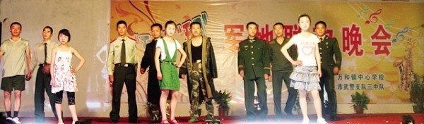 五四前夕,曾都区万和中心学校与大山深处的市武警支队三中队欢聚一堂,载歌载舞庆“五四”,既展示了师生风采,又搭建起一个和谐的军民共建交流平台。图为学生和军人同台演出的《模特秀》。 (本报记者 杨闻名 通讯员 杨海波 邱必臣摄)