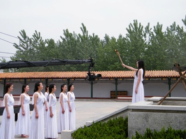 5月5日,承担首届世界华人炎帝故里寻根节策划重任的金鹰传媒集团主创人员,来到炎帝神农故里风景区,在神农文化广场拍摄由九位少女在九米高的汉白玉神农雕像下,从陶盆的天然木炭上采集炎帝圣火的情景。据悉,开幕式当日,炎帝神农大殿两侧将竖立两个特大型电子屏幕,向参加寻根节的嘉宾及世界华人再现九少女采集并点燃寻根节“圣火”镜头。 (龚承斌 摄)