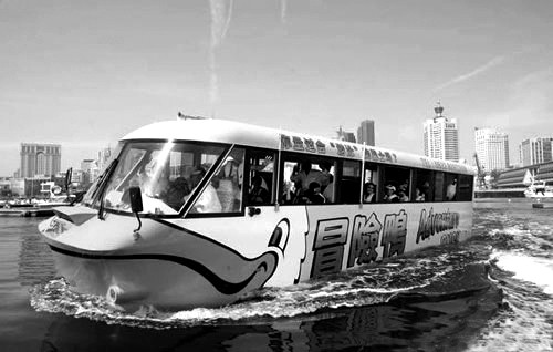 今年5月5日,楚风水陆两栖巴士在青岛奥帆中心下水试航,这辆造价近600万元的巴士能容纳乘客38人,水中速度可达10节 (时速约18公里),陆上的时速最高达120公里,是一辆可以陆地走、水里游的两栖观光巴士。