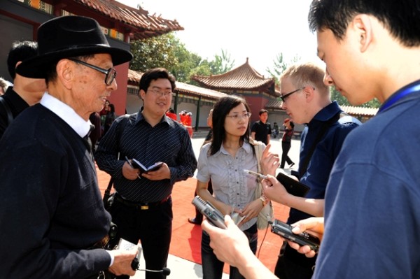 5月6日,“重走神农路·寻根鄂湘行”大型跨省媒体连线宣传新闻采访团第一站来到随州炎帝神农故里风景区。图为中国日报外籍记者正在厉山采访拜祖仪式司仪。 (本报记者 李文军摄)