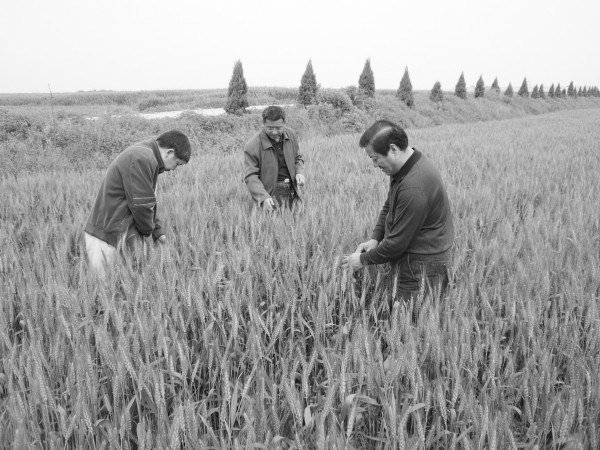 图为5月5日,市农科所高级农艺师黄成顺(右)等在万福店小麦良种繁育基地查看新品种瑞星一号长势。 (王 峰摄)