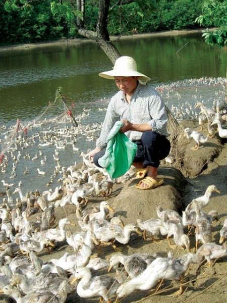 曾都区新街镇个体老板蒋守国瞄准市场行情,在柳林镇双利村承包了40亩水面,发展立体养鸭8000只,年创收入近10万元,起到了良好的示范引路作用。图为鸭厂饲养员在给鸭喂食。 (程立键摄)