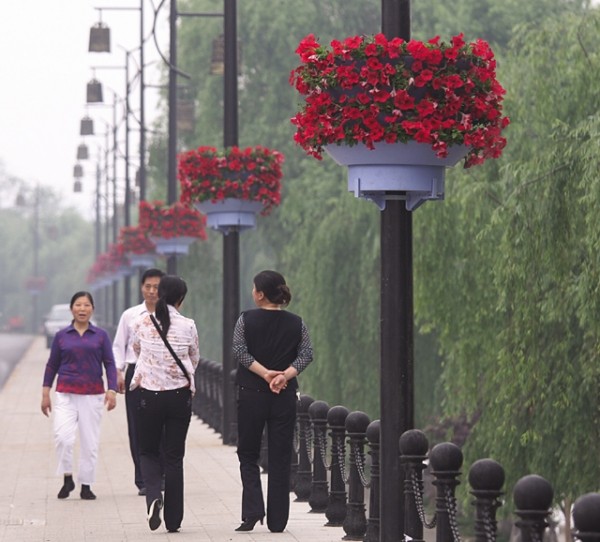 随城白云湖东大堤空中花篮鲜花盛开。为“寻根节”营造节日氛围,市园林部门投资100余万元,在城区主要街道、景点等场所摆放近百万盆鲜花扮靓随城。 (本报记者 杨闻名 通讯员 刘红元摄)
