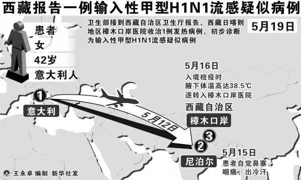 新华社5月19日电 卫生部19日通报,当天凌晨,卫生部接到西藏自治区卫生厅报告,西藏日喀则地区樟木口岸医院收治1例发热病例,初步诊断为输入性甲型H1N1流感疑似病例。