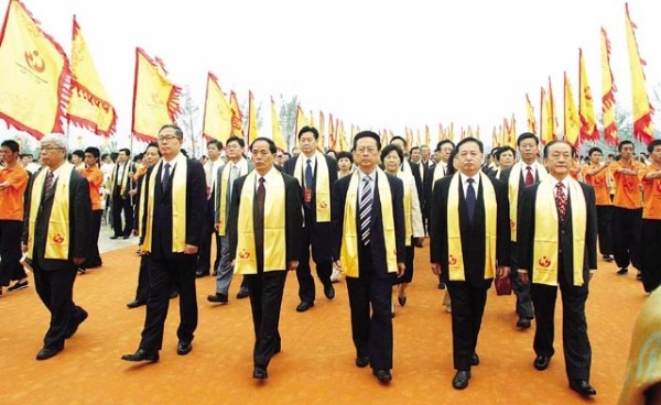 图一:全国人大常委会副委员长陈昌智(前排右三),全国政协副主席李兆焯(前排右四),湖北省委书记罗清泉(前排右二),湖北省人民政府省长李鸿忠(前排左二)等领导步入拜祖大典现场。 (本报记者 孙洪涛摄)
