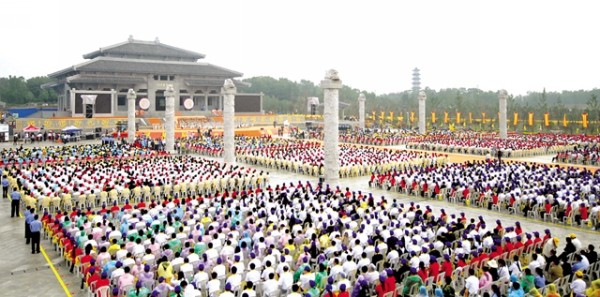 阵容整齐,气势恢宏,隆重的拜祖大典在细雨和阳光中进行。 (本报记者 杨闻名摄)