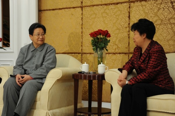 图片:副省长张岱梨(右)和李讷(毛泽东的女儿)亲切交谈。(本报记者 李文军摄)
