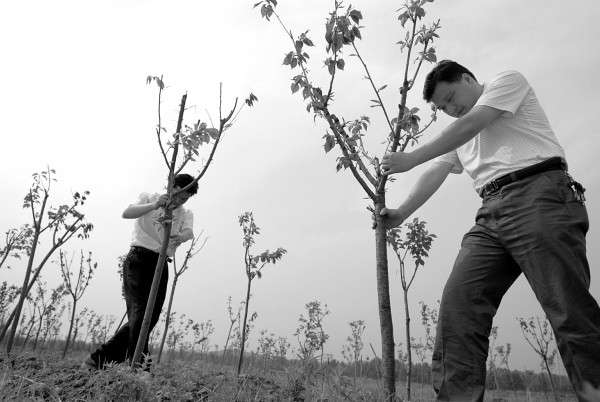 昨日,随州籍山东青岛客商陈正滋、张华山先生向我市捐赠一百多万元绿化苗及园林景观石,支援家乡园林绿化事业发展。图为园林人员在给捐赠的樱花苗木移植管理。(本报记者杨闻名通讯员刘红元摄)