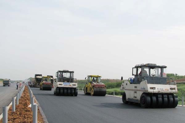 随岳高速公路随淮段建设者以劳动竞赛为载体,向6月底竣工通车的目标发起最后冲刺。图为高速公路厉山段路面施工现场。