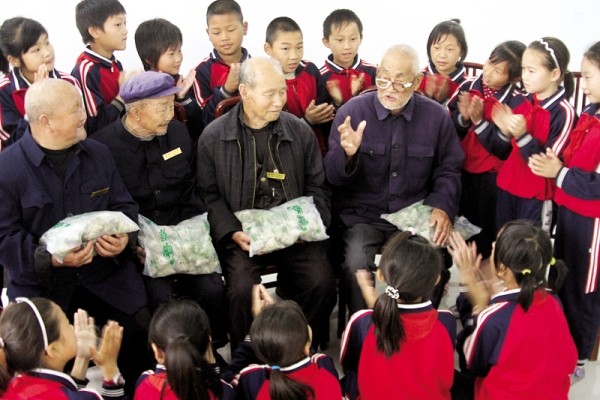 前往区光荣院慰问老军人。图为学生们欢聚一堂听老军人讲端午节故事。(本报记者杨闻名摄)
