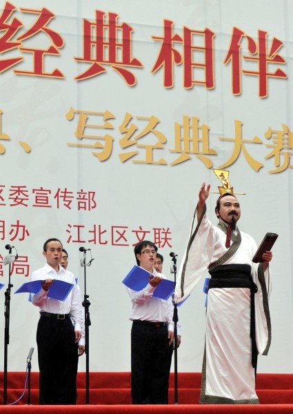 图⑤演员在重庆观音桥广场举行的经典诵读大赛上表演。连日来,一场“端午传承文明 经典相伴人生”经典诵读大赛在重庆观音桥广场举行。