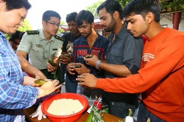 图③4名印度海员在学包粽子。浙江宁波举办“相约端午,招宝飘香”活动。来自韩国、印度、菲律宾等地的外国友人体验中国的端午文化。