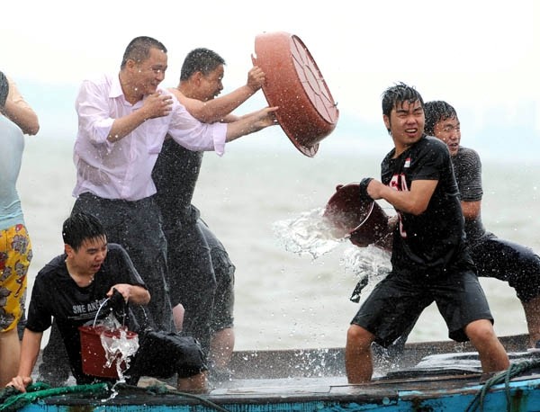 图④闽台两地青年海上泼水闹端午。来自台北、鹿港两地的100余位台湾乡亲与蚶江镇群众海上泼水狂欢,共同庆祝端午佳节。