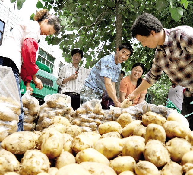 5月30日,武汉来的蔬菜经销商在曾都区厉山镇勤劳村收购新上市的土豆。勤劳村240余亩土豆今年获得丰收,因个儿大体圆吸引了大量外地商人前来收购,每天收购七八卡车。 (本报记者 李文军摄)