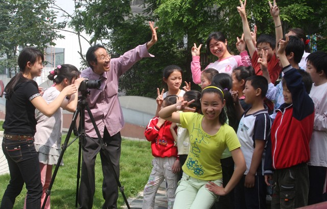 昨日,随城楚兴缘圆婚纱影楼摄影师黄朝恩(左三),带着一片爱心来到市特殊教育学校,免费为聋哑孩子拍照留影,给孩子们留下美好的瞬间。图为孩子们和摄影师在一起。(本报记者 杨闻名摄)