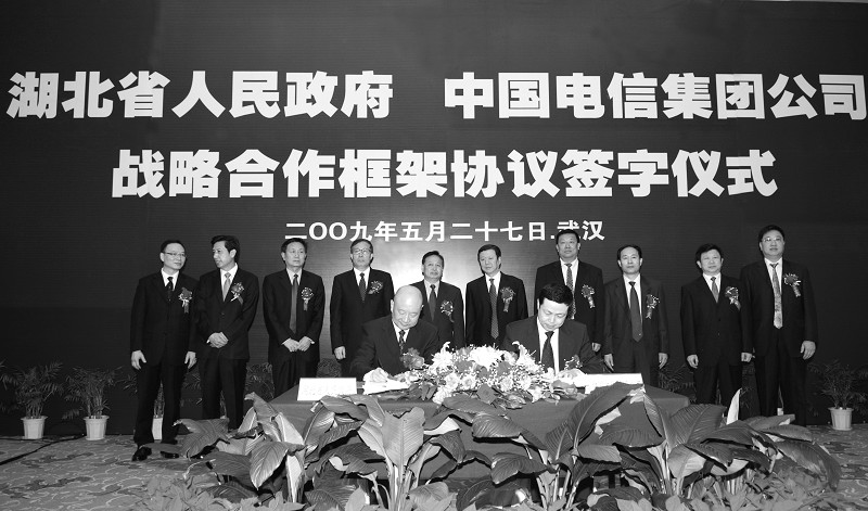 5月27日,湖北省人民政府与中国电信集团公司签订战略合作框架协议,双方在信息化和信息产业领域开展深度合作。在未来五年内,中国电信计划投资150亿元加强湖北信息化基础设施建设,用于打造中部地区最大的信息通信枢纽中心和优质高效的信息服务平台,建设遍布城乡的高速无线网络和宽带网络,支撑十大信息化项目实施。