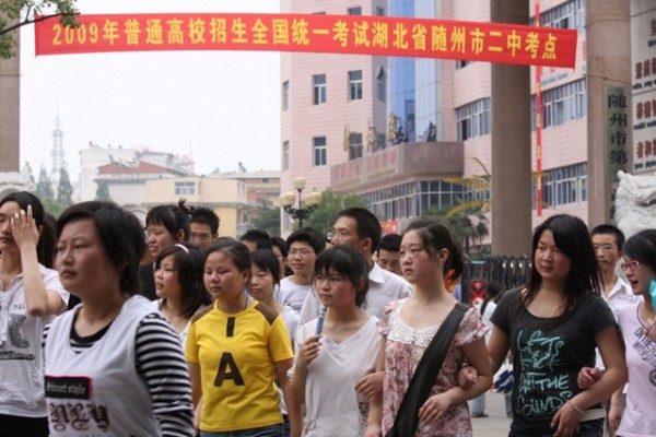 昨日,一些考生来到市二中考点了解自己的考场位置,熟悉环境。图为看完考点的考生手挽手高兴地走出校外。(本报记者 杨闻名摄)