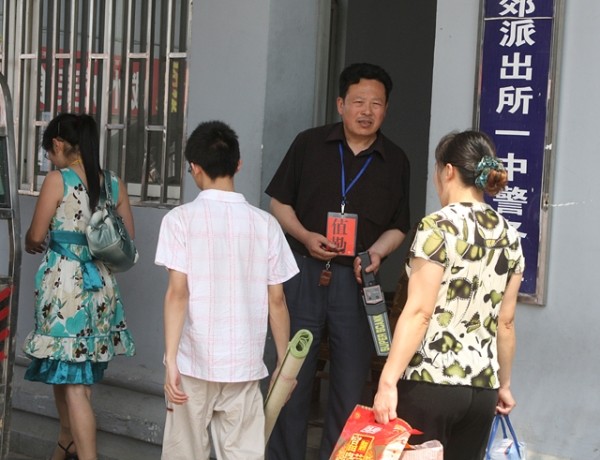 昨日,随州一中值勤安保人员对进入的人员严格认真检查,确保考点安全保障。(本报记者 杨闻名摄)