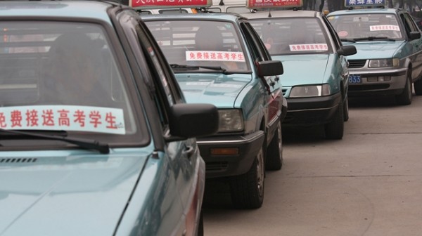 六月七日,市城运处组织近百辆的士免费接送高考学生。(本报记者 杨闻名 通讯员 朱大伟 摄)