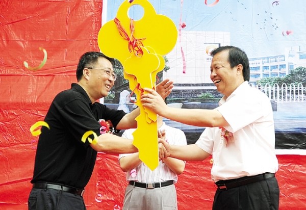 市委书记马清明(右)向雅安市委常委、副市长、汉源县委书记杨承一交付教学综合楼钥匙。(特派记者 李文军 摄)