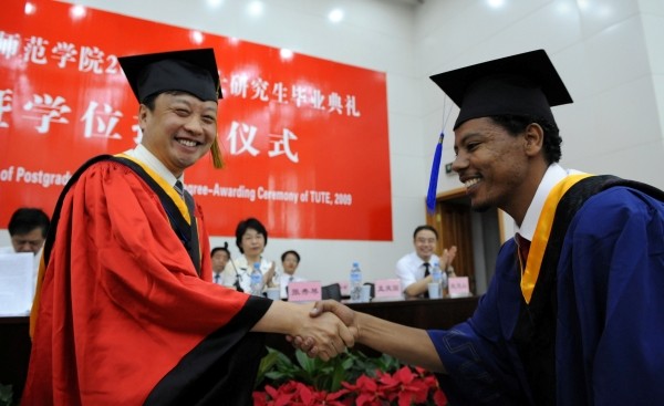 6月14日,天津工程师范学院院长孟庆国在给来自埃塞俄比亚的高山(右)授予硕士学位。当日,高山和高兴作为中国为非洲培养的“双证”硕士生,在天津工程师范学院正式毕业。他们不仅取得硕士学位毕业证书,还顺利通过中国国家中级职业资格认定,获得中国国家中级职业资格证书。 (新华社发)
