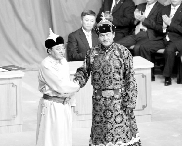 6月18日,在蒙古国首都乌兰巴托国家宫举行的总统就职仪式上,蒙古国当选总统查希亚·额勒贝格道尔吉(左)与卸任总统那木巴尔·恩赫巴亚尔握手。在5月24日举行的蒙古国总统选举中,蒙民主党候选人、前总理额勒贝格道尔吉当选蒙古国第5任总统。 (新华社发)