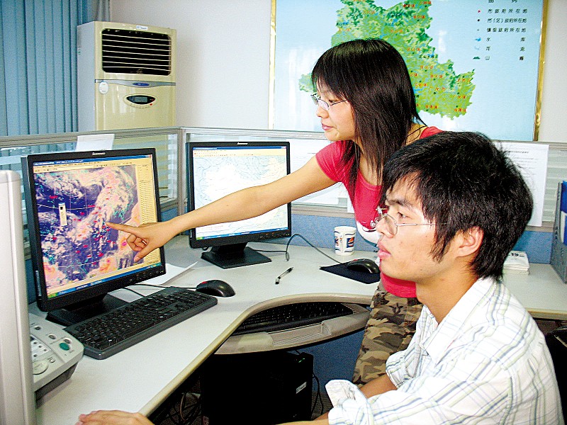 昨日,随州市气象防灾减灾指挥中心工作人员在电脑前观测强对流天气变化,并预报雷电黄色预警信号一次。 (本报记者 杨闻名摄)