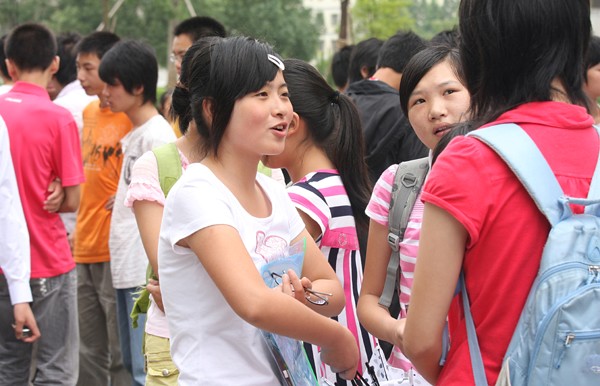 20日上午,第一场考试完后,学生们愉快地交谈考试心得。 (杨闻名摄)
