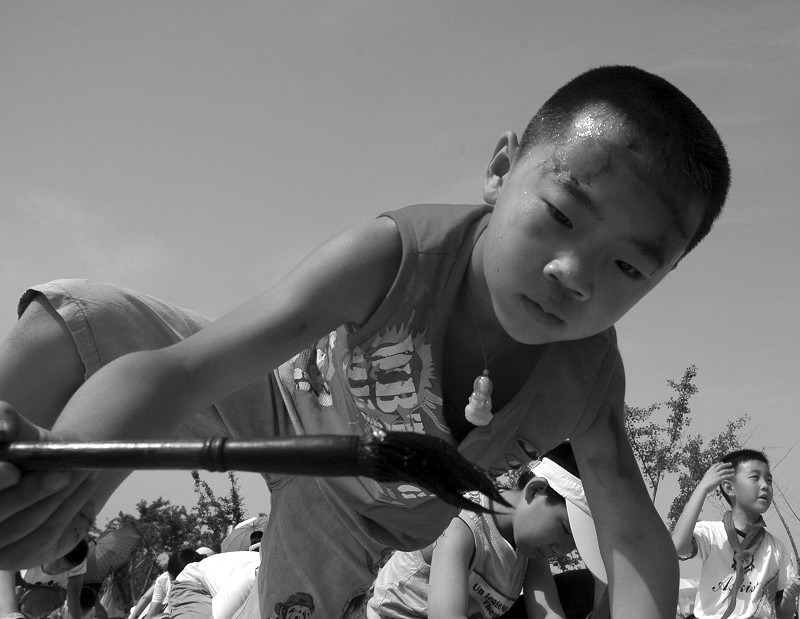 6月20日,在河南省安阳市博物馆图书馆综合大楼前,一名小朋友在书法比赛中挥毫。当日,河南省安阳市举办“纪念中华人民共和国成立60周年 颂中华爱安阳 ——万人挥毫泼墨书法大赛”。 新华社发