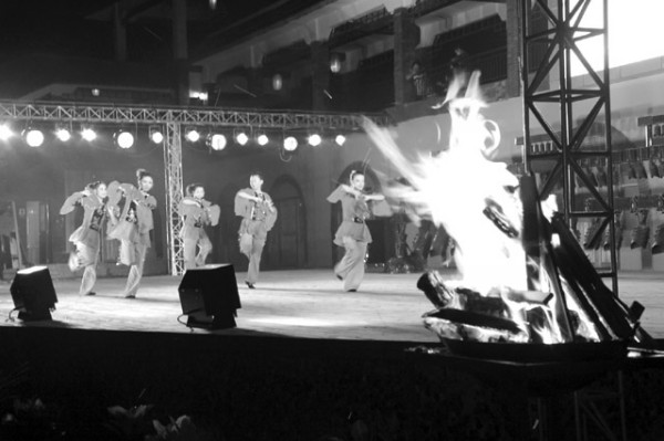 6月27日晚,玉龙温泉水上娱乐园提前热身,宏大的舞台配以仿制编钟为背景,上演的欢歌劲舞,衬以篝火映照,深受省内外千余观众欢迎。 (本报记者 后 勤摄)